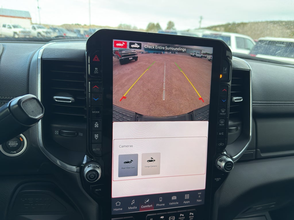 Laramie Level 2 Plus Equipment Group: Google Android Auto; SiriusXM Radio Service; Power Adjustable Pedals with Memory; For Details Visit DriveUconnect.com; For More Info. Call 800-643-2112; Integrated Voice Command with Bluetooth®; Emergency Vehicle Alert System (EVAS); Power Deployable Running Boards; Auto Power-Folding Mirrors; Mirror Running Lights; Drowsy Driver Detection; MOPAR Deployable Bed Step; Alexa Built-In; Apple CarPlay; Power-Adjustable Convex Aux Mirrors; Active Lane Management System; Forward and Reverse Utility Lights; Disassociated Touchscreen Display; Remote Tailgate Release; 17 Speaker Harman/kardon Premium Sound; #1 Seat Foam Cushion; 2nd Row in Floor Storage Bins; Center Stop Lamp with Cargo View Camera; Rain Sensitive Windshield Wipers; LED Bed Lighting; Traffic Sign Recognition; Connectivity - US/Canada; GPS Navigation; 4G LTE Wi-Fi Hot Spot; Adaptive Steering System; GPS Antenna Input; Exterior Mirrors with Heating Element; Auto Dimming Exterior Mirrors; SiriusXM with 360L; Global Telematics Box Module; Connected Travel and Traffic Services; Foam Bottle Insert (door Trim Panel); Off-Road Information Pages; Selectable Tire Fill Alert; Trailer Tow Pages; Leather Trimmed Bucket Seats; HD Radio; 14.4" Touchscreen Display; Power Heat Fold Memory Telescopic Mirrors; Exterior Mirrors with Supplemental Signals; Exterior Mirrors Courtesy Lamps; Uconnect 5 Nav with 14.4" Display; MOPAR Spray in Bedliner; Auto High Beam Headlamp Control; Chrome Exterior Mirrors; Exterior Mirrors with Memory; Power Adjust Mirrors; Power Telescoping Mirrors; Auto Dimming Exterior Passenger Mirror; Auto Adjust in Reverse Exterior Mirrors. Quick Order Package 24H Laramie. Max Tow Package: Auto Level Rear Air Suspension; 5th Wheel/gooseneck Towing Prep Group. Dual Rear Wheels: Clearance Lamps; 17" Steel Spare Wheel; Box and Rear Fender Clearance Lamps; Center Hub; 6000# Front Axle with Hub Extension; 17" X 6.0" Polished Aluminum Wheels; 14. 000 Lb GVWR. Auto Level Rear Air Suspension. LT235/80R17E Off Road Tires. Power Deployable Running Boards. Leather Trimmed Bucket Seats. 5th Wheel/gooseneck Towing Prep Group. Center Stop Lamp with Cargo View Camera. 50 Gallon Fuel Tank. Instrument Panel Mounted Auxiliary Switches. Diamond Black Crystal PC. MOPAR Front and Rear Rubber Floor Mats. Clearance Lamps. **Equipment listed is based on original vehicle build and subject to change. Please confirm the accuracy of the included equipment by calling the d